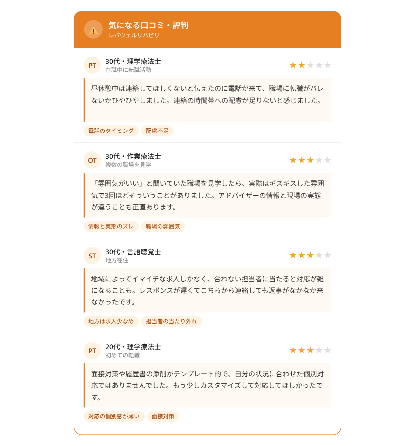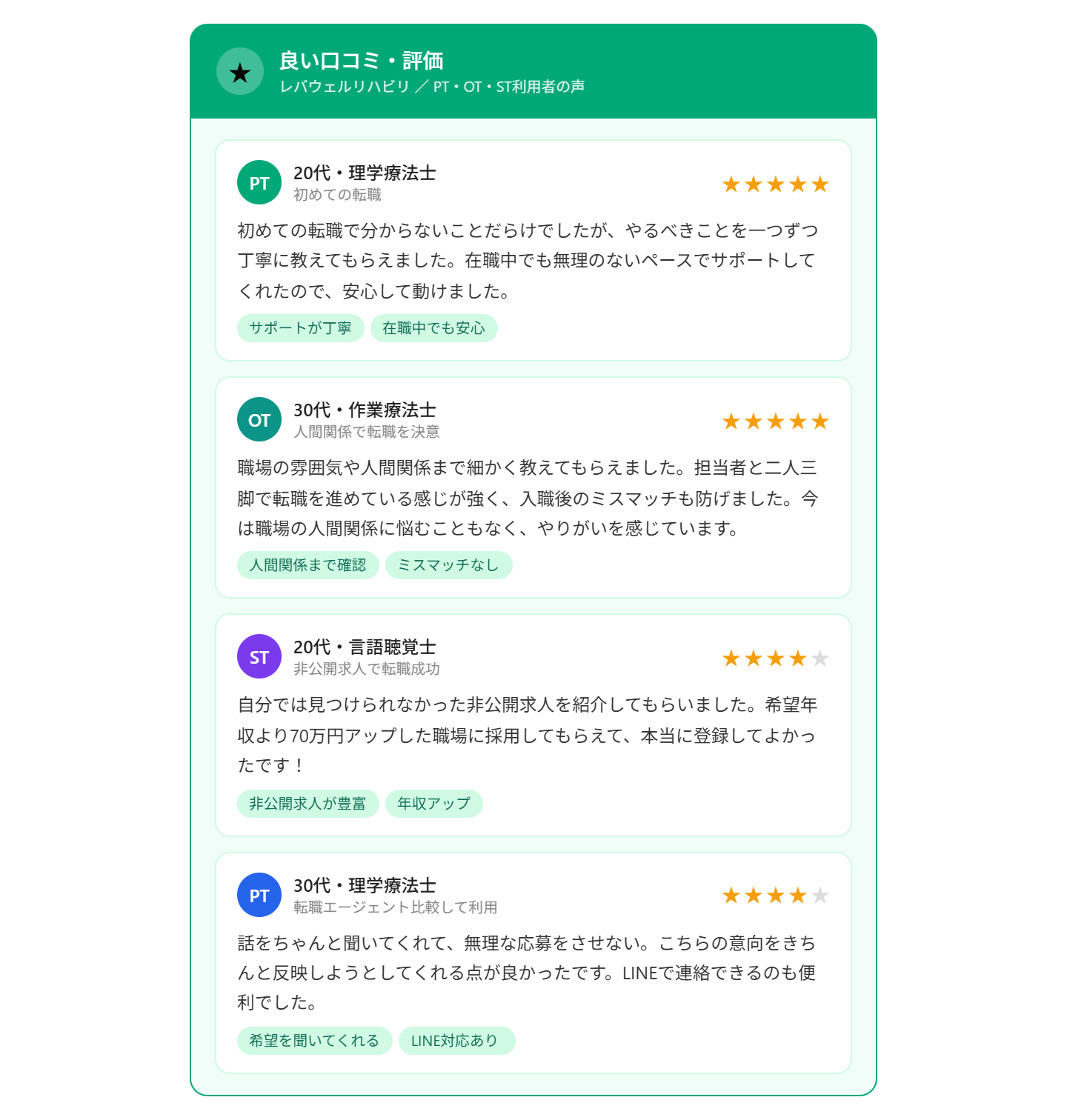 また、非公開求人の豊富さも好評で、自分では気づけなかった選択肢に出会えたという声も多くありました。年収アップにつながったケースも複数あり、リハビリ職に特化しているサービスならではの強みが出ていると感じます。