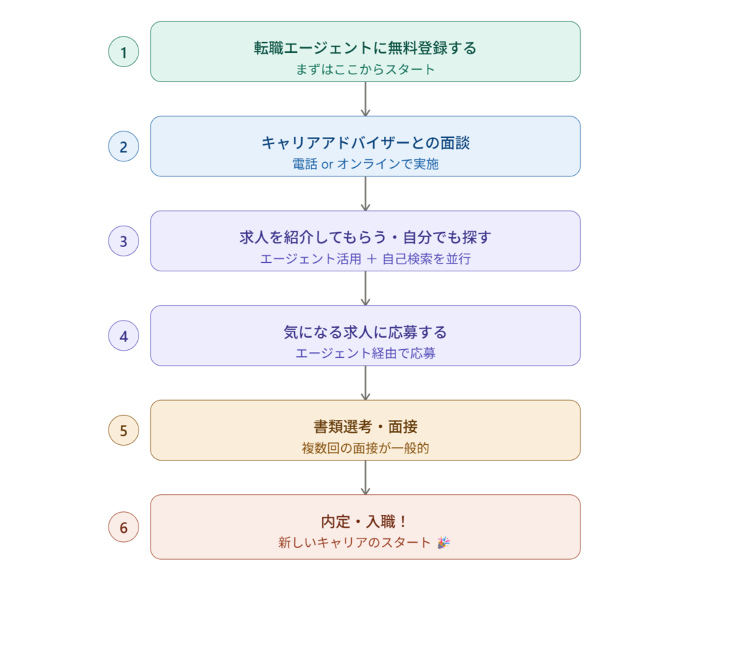 転職エージェントを使った転職活動の流れはこのとおりです。